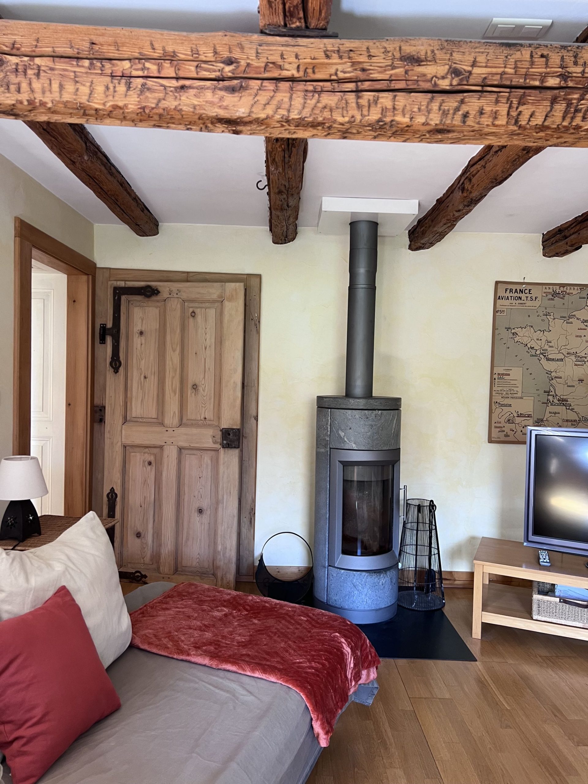 Grand salon chaleureux avec poêle à bois et poutres apparentes.