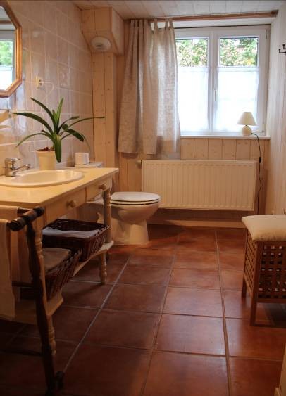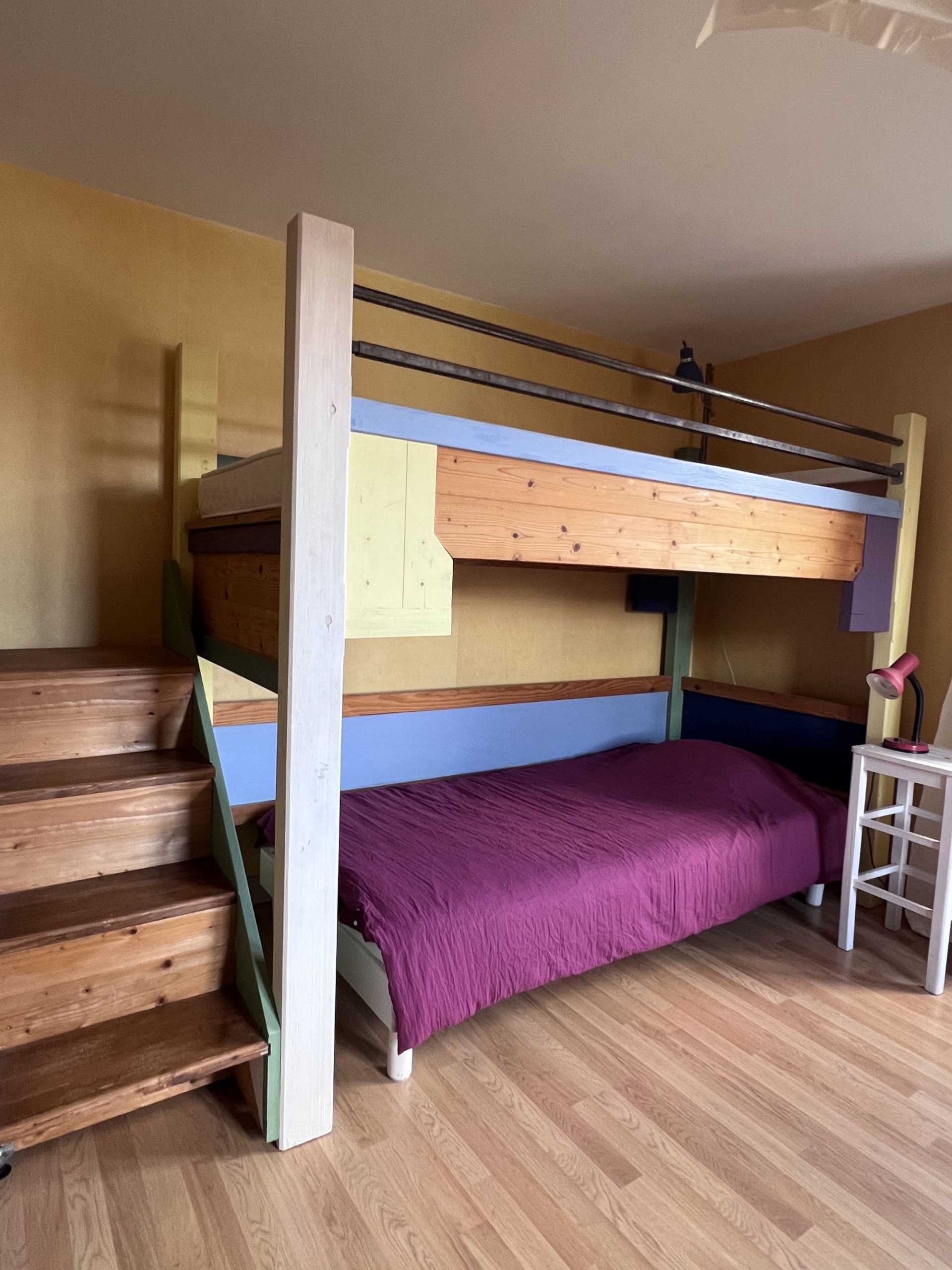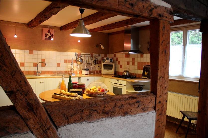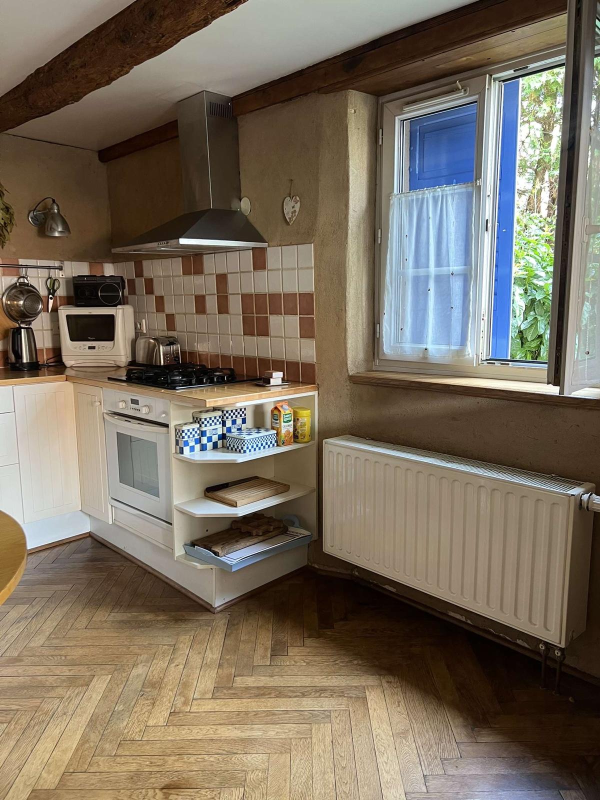 Cuisine : vaste plan de travail, four, micro-ondes, lave-vaisselle, réfrigérateur, table de cuisson avec 4 brûleurs au gaz, hotte, robot ménager, toute la vaisselle nécessaire, nombreux rangements.