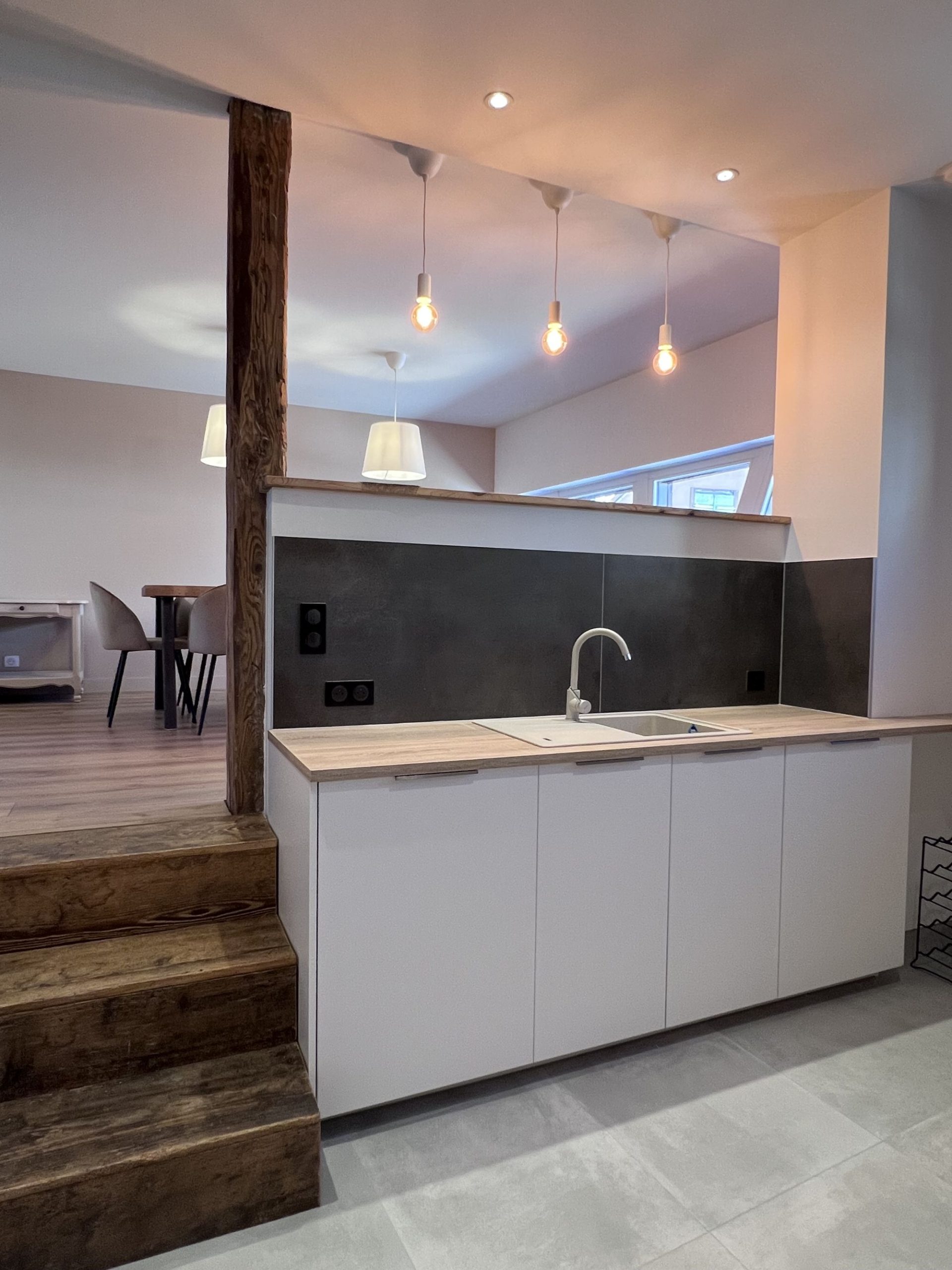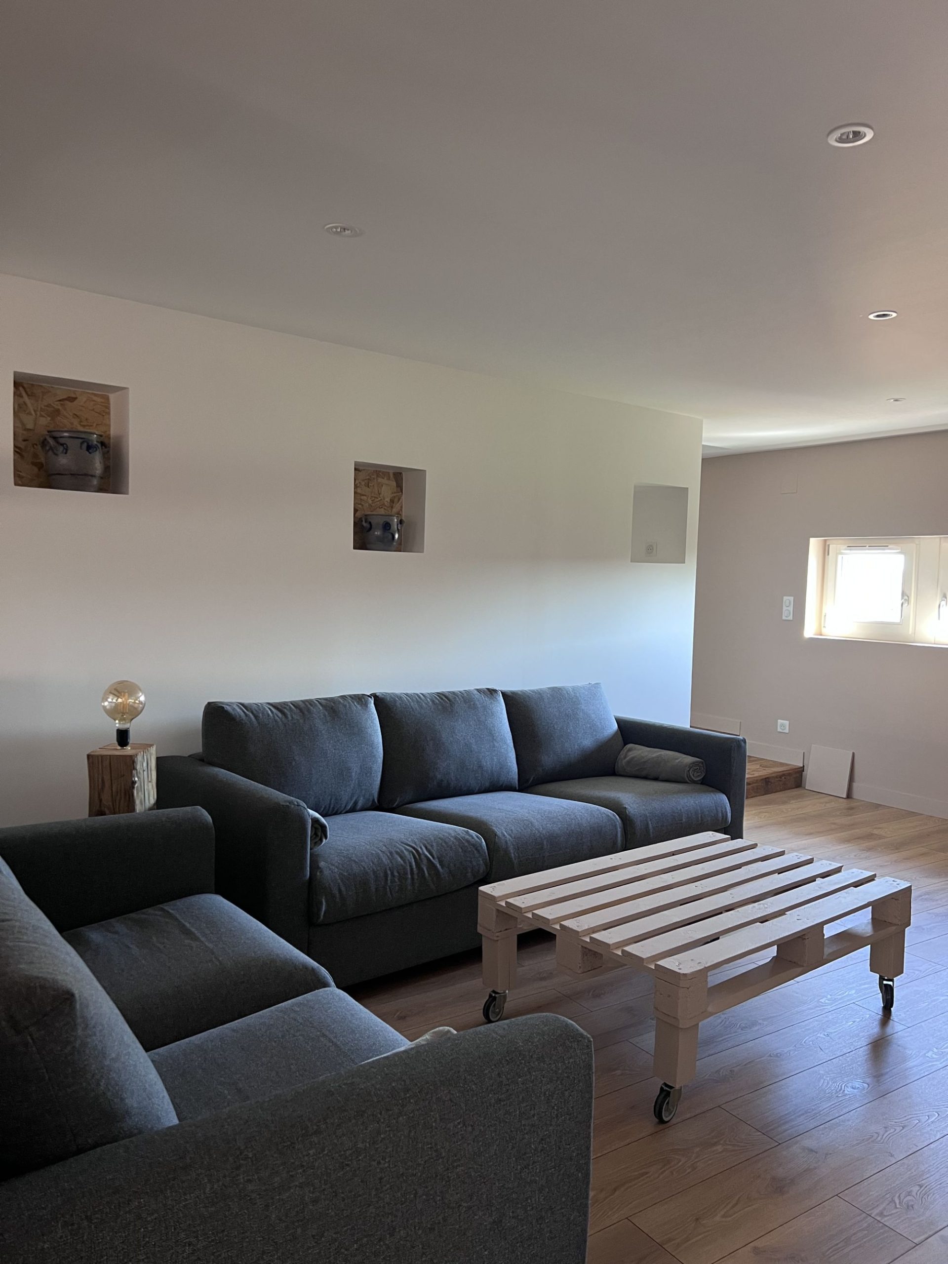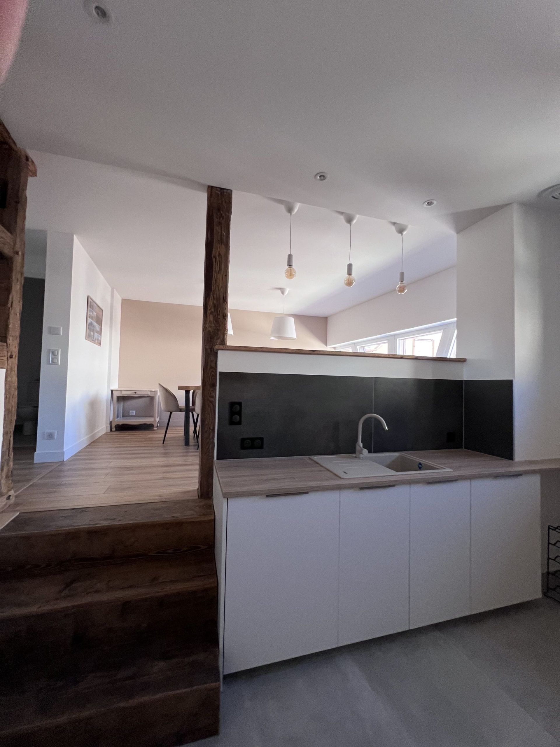 - 1er étage : une grande pièce de vie conviviale composée d’une cuisine équipée, d’une salle à manger lumineuse et d’un salon chaleureux. Vous y trouverez également une chambre avec un lit double (160 cm) ainsi qu’un WC indépendant.
