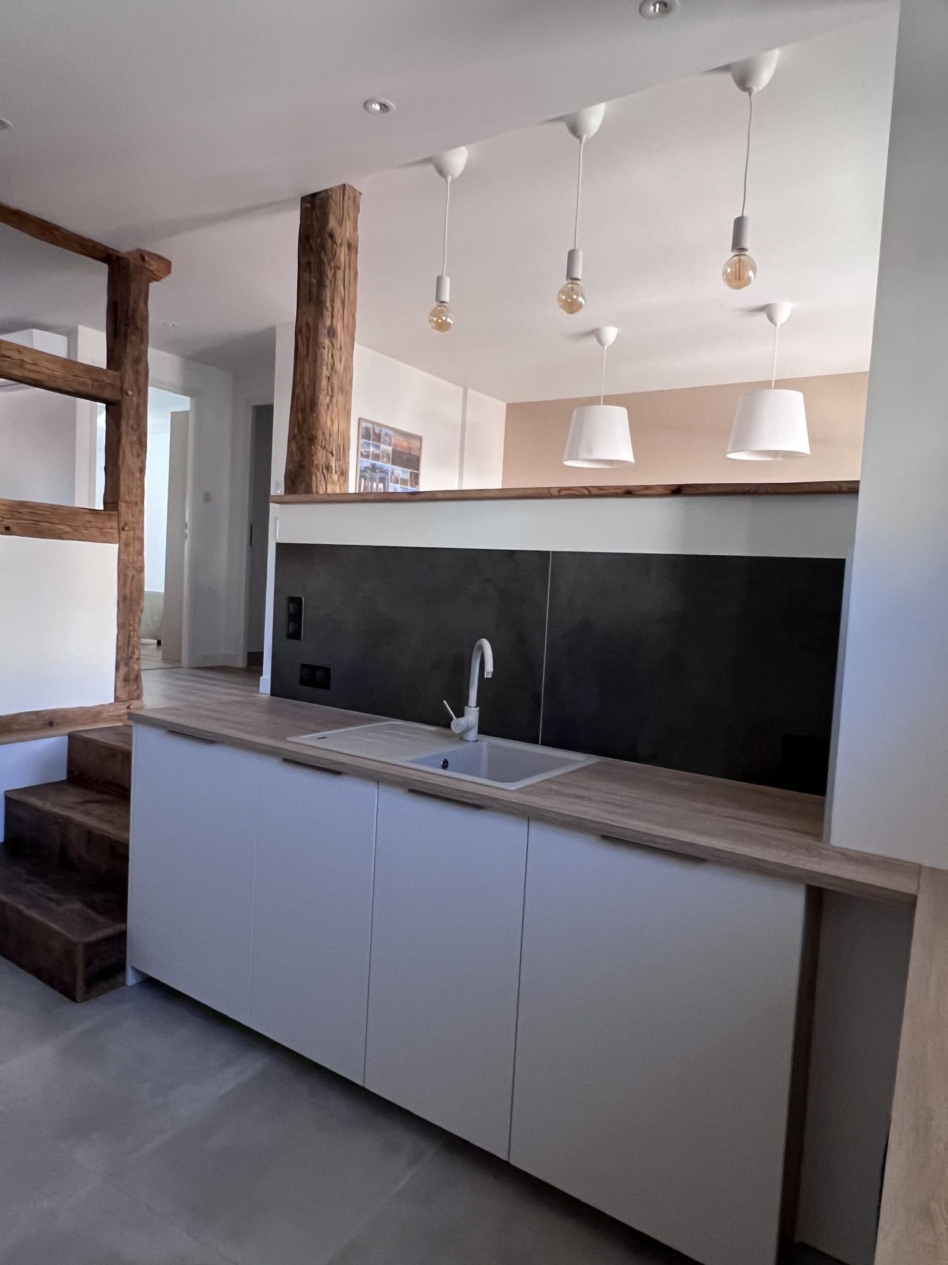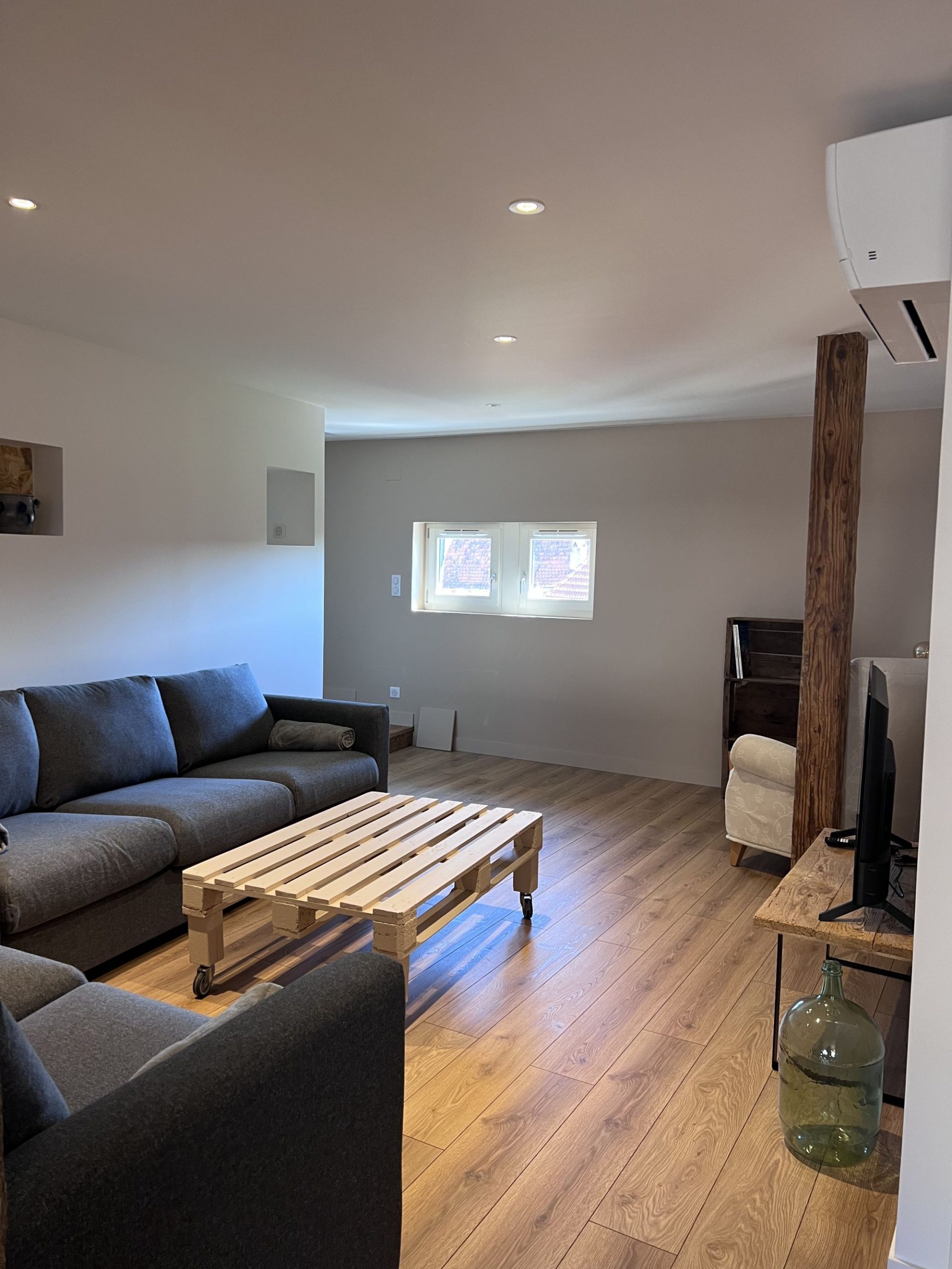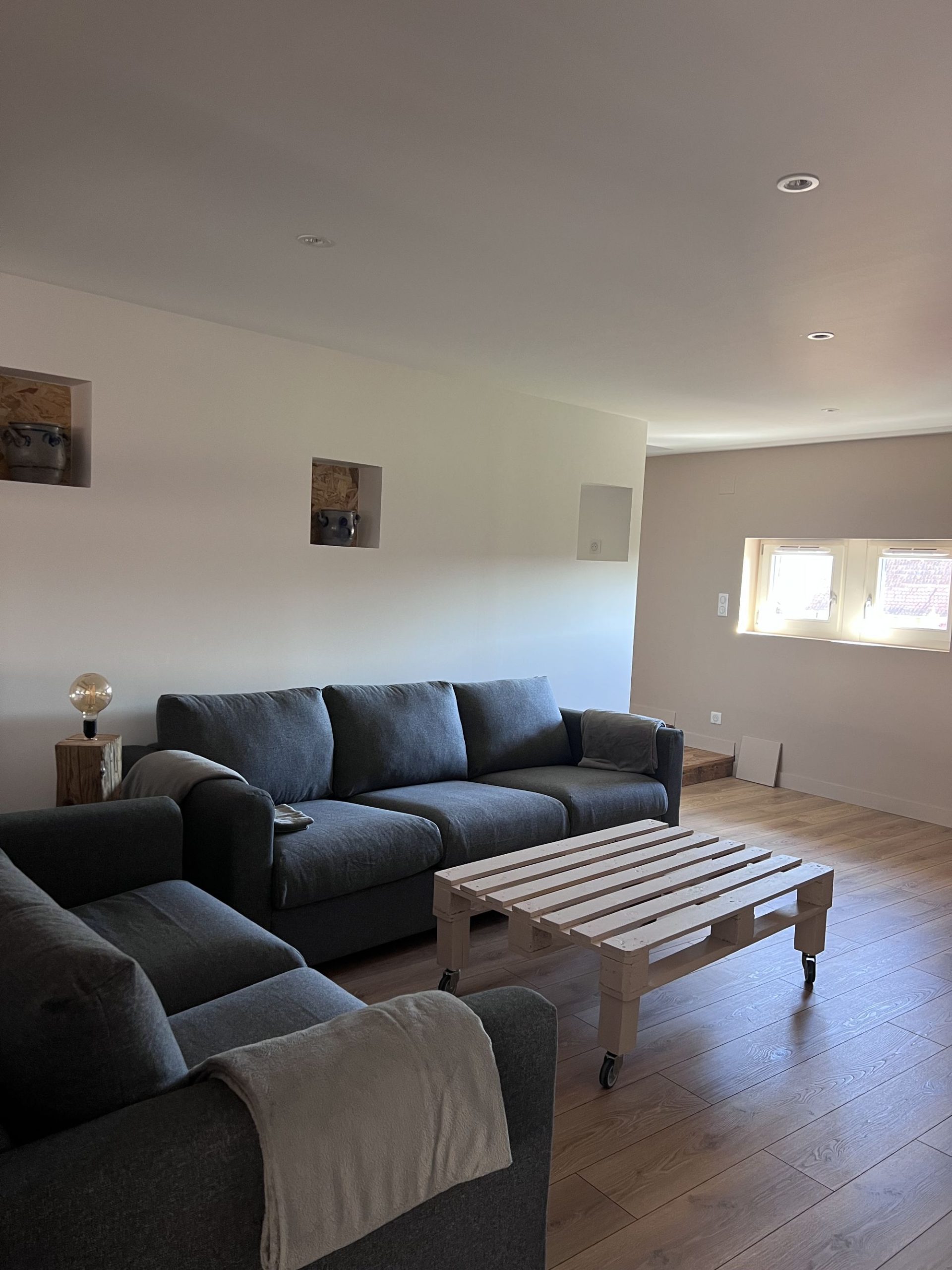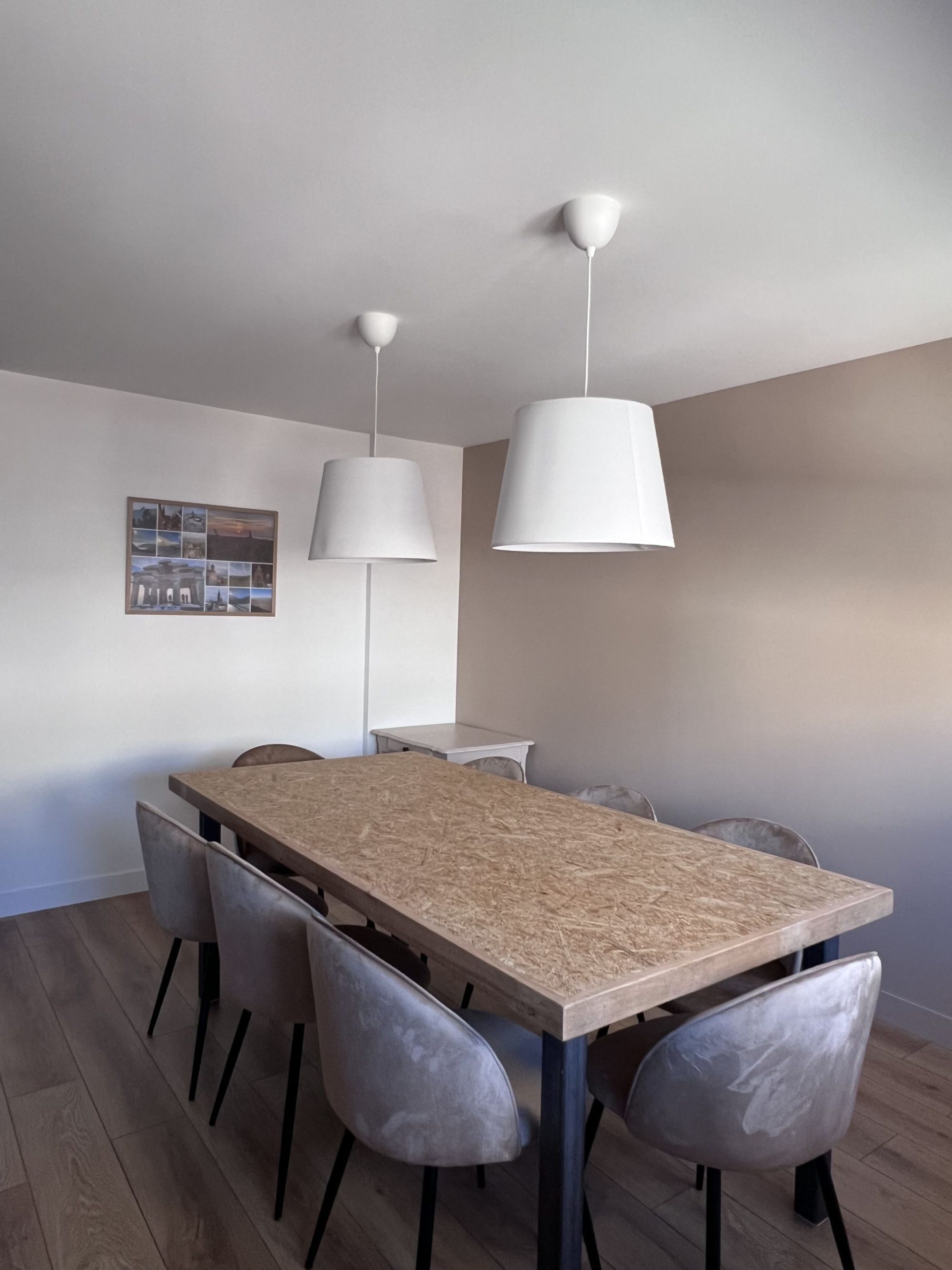 - 1er étage : une grande pièce de vie conviviale composée d’une cuisine équipée, d’une salle à manger lumineuse et d’un salon chaleureux. Vous y trouverez également une chambre avec un lit double (160 cm) ainsi qu’un WC indépendant.