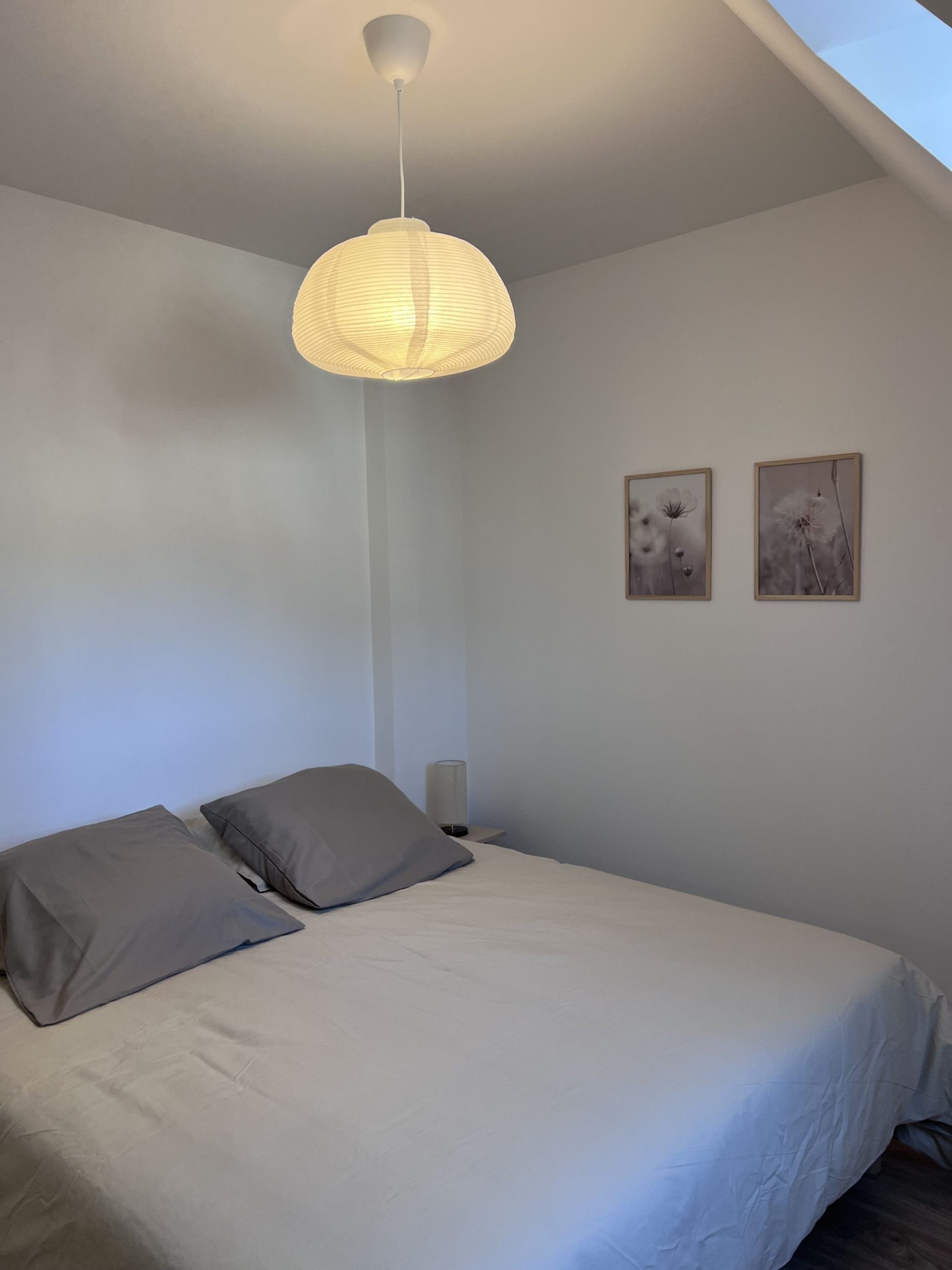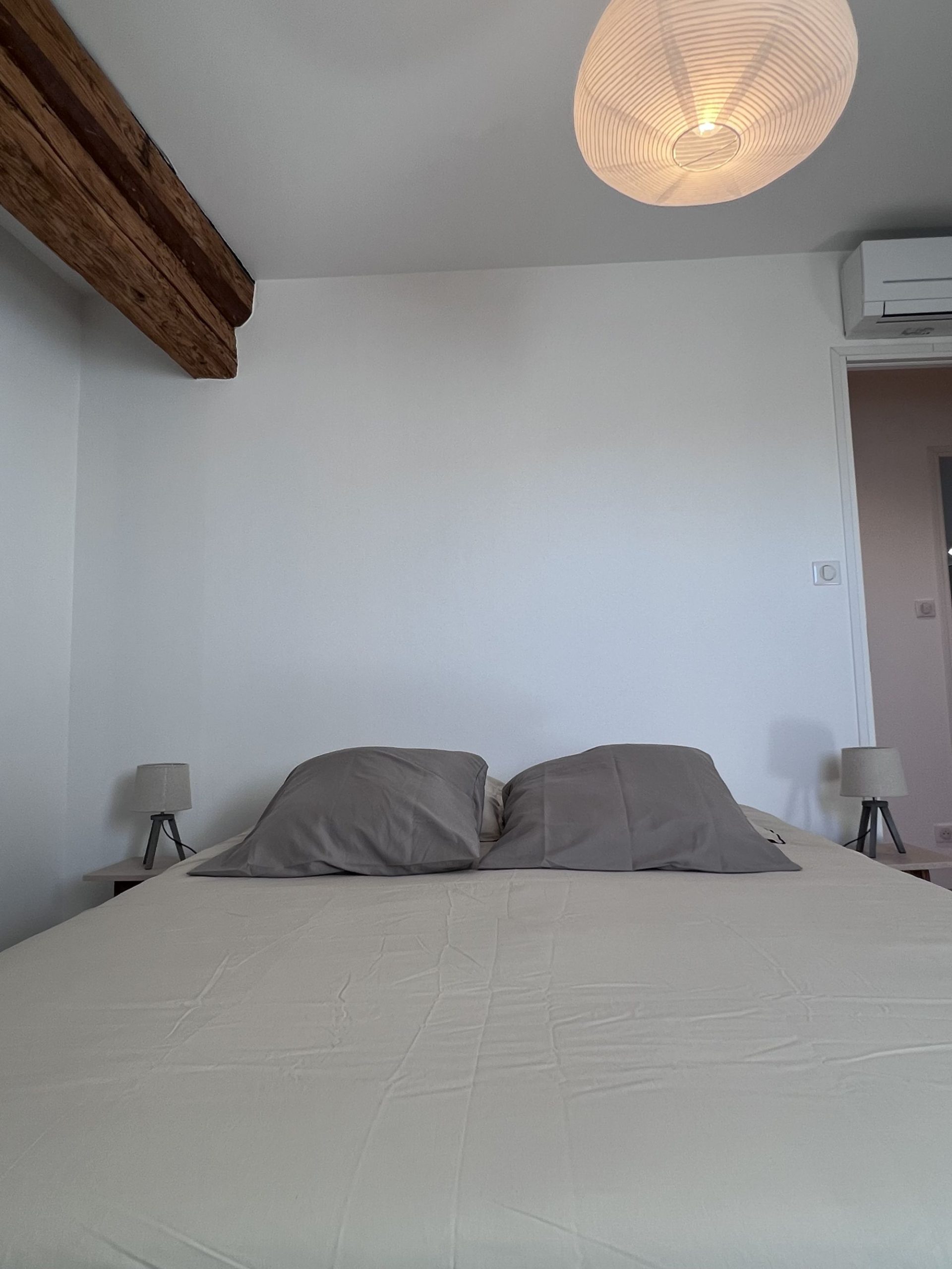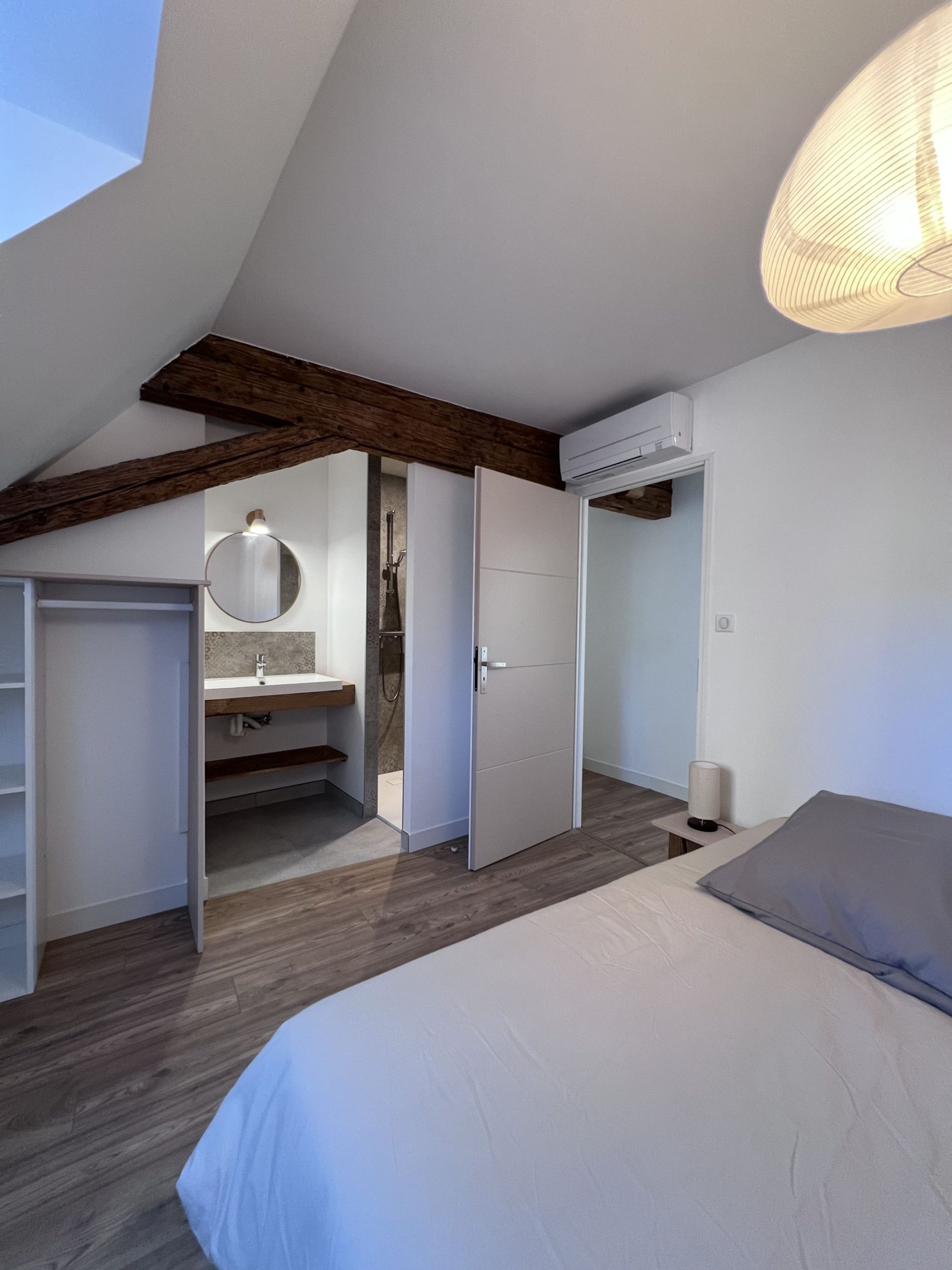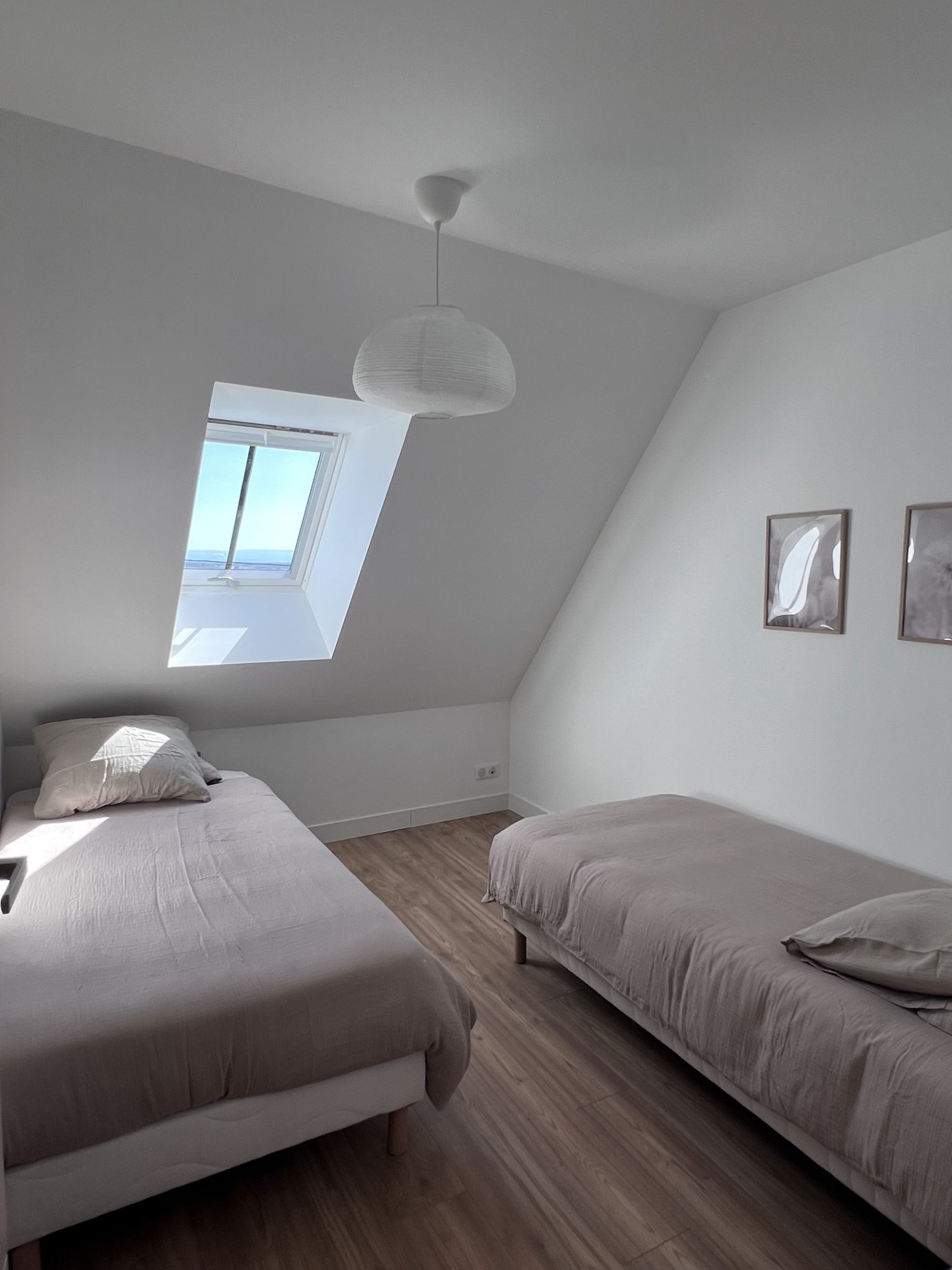 - 2e étage : une salle de bain spacieuse avec WC, une chambre avec lit double (160 cm), une chambre avec 2 lits simples et une suite parentale avec lit double (160 cm) et salle d’eau privative.