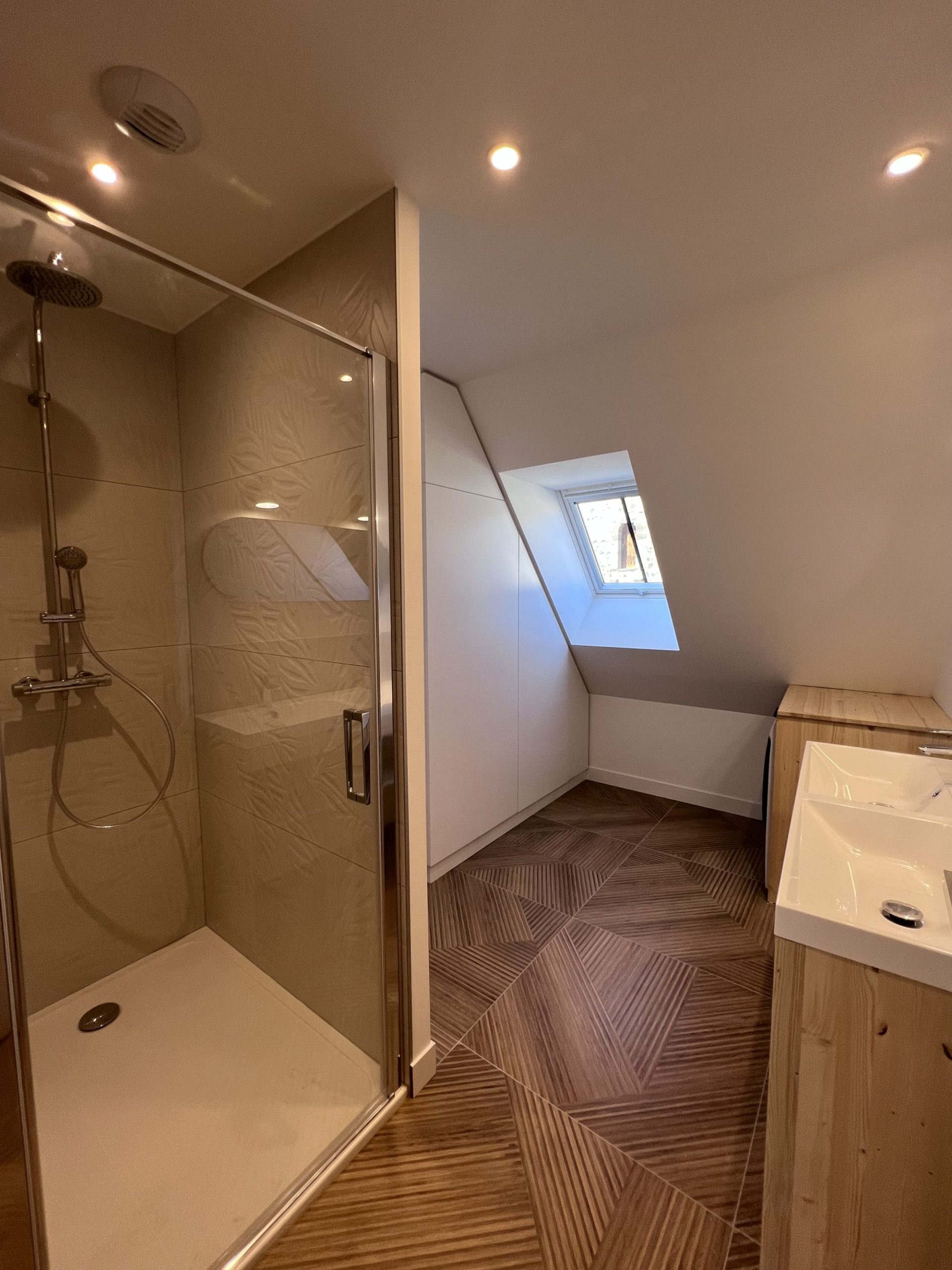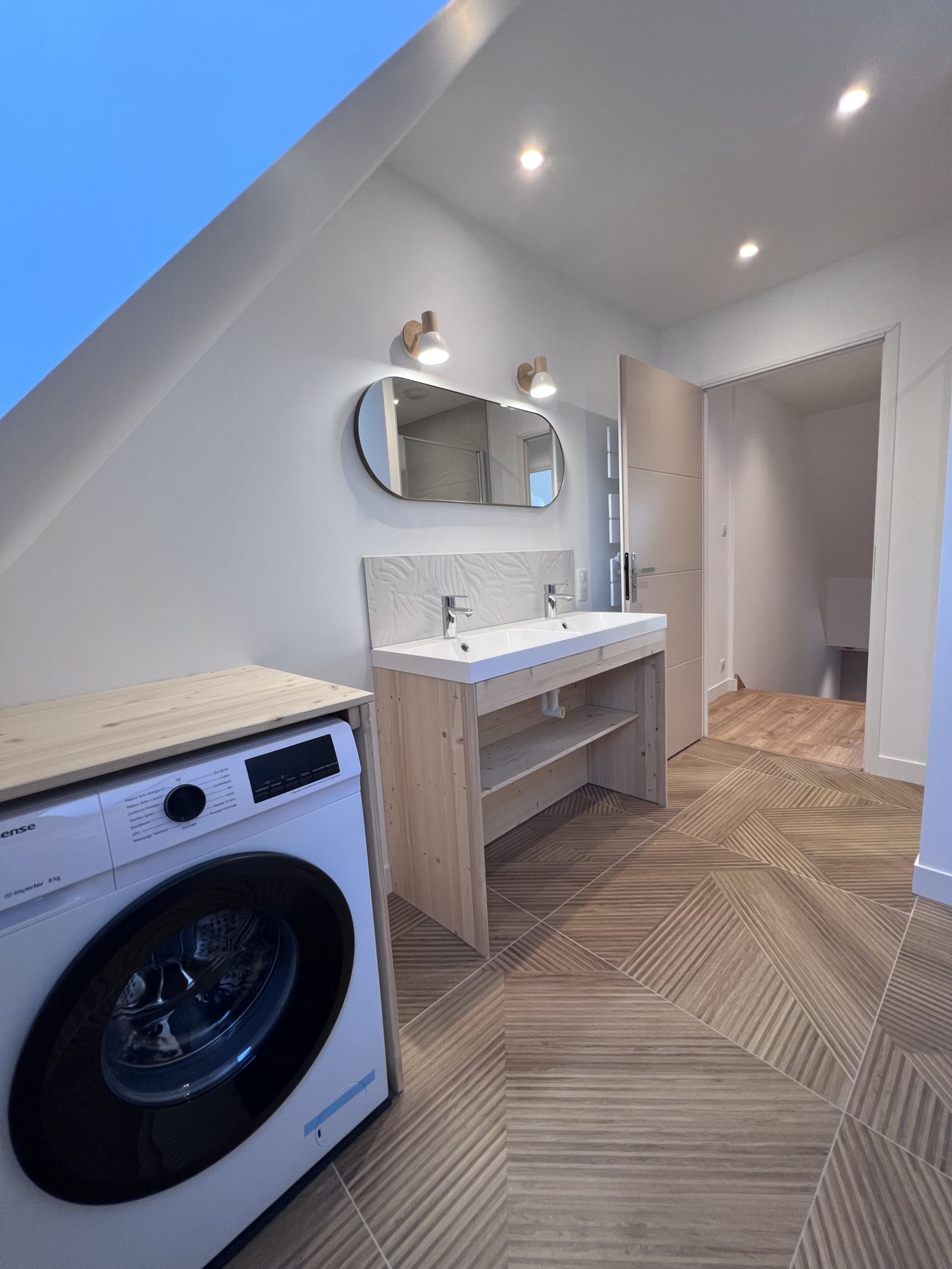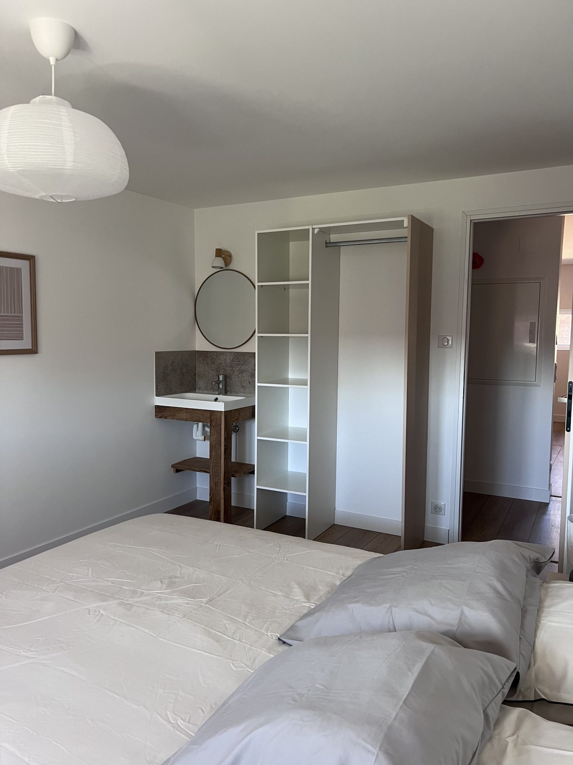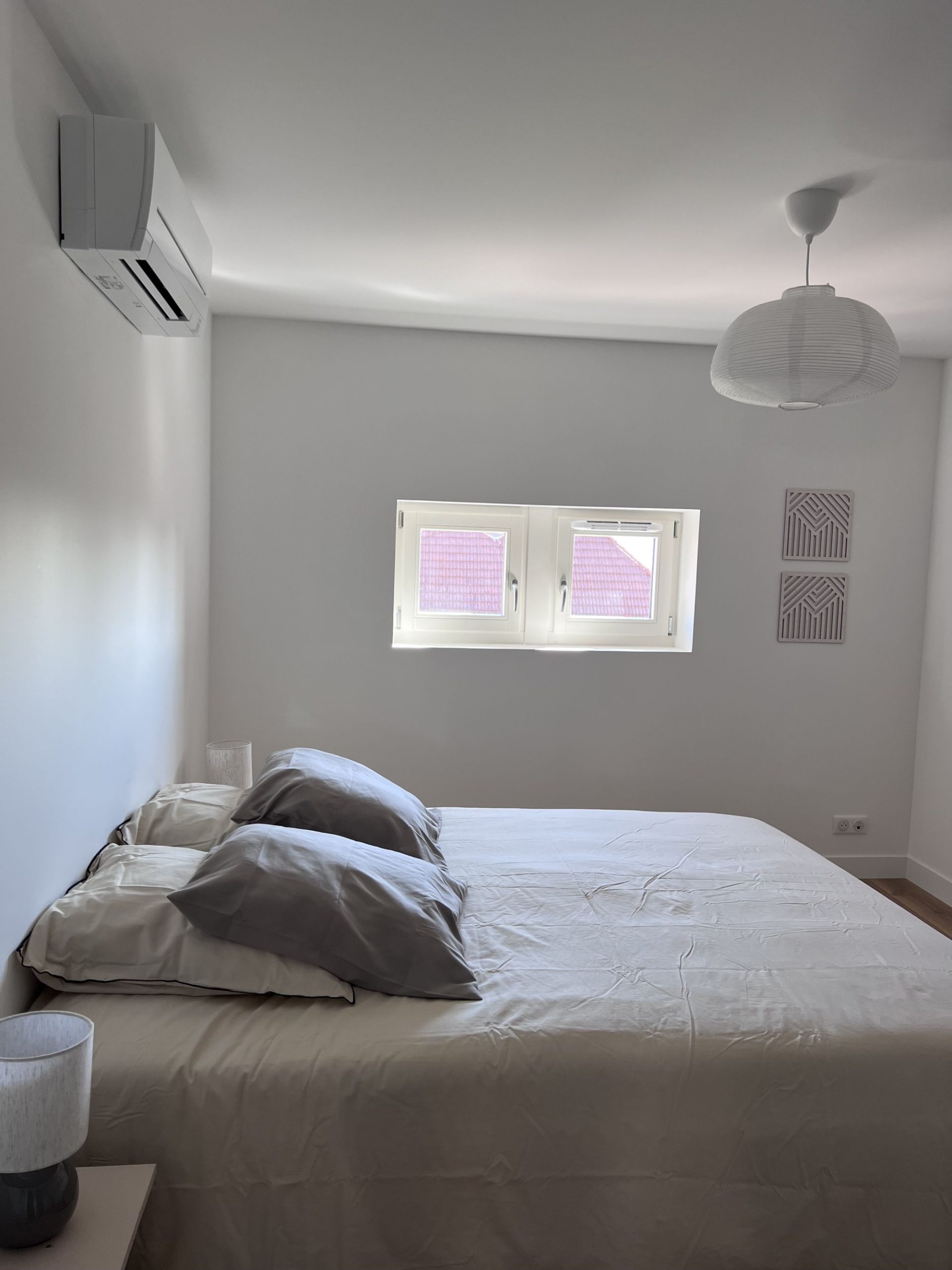 - 2e étage : une salle de bain spacieuse avec WC, une chambre avec lit double (160 cm), une chambre avec 2 lits simples et une suite parentale avec lit double (160 cm) et salle d’eau privative.
