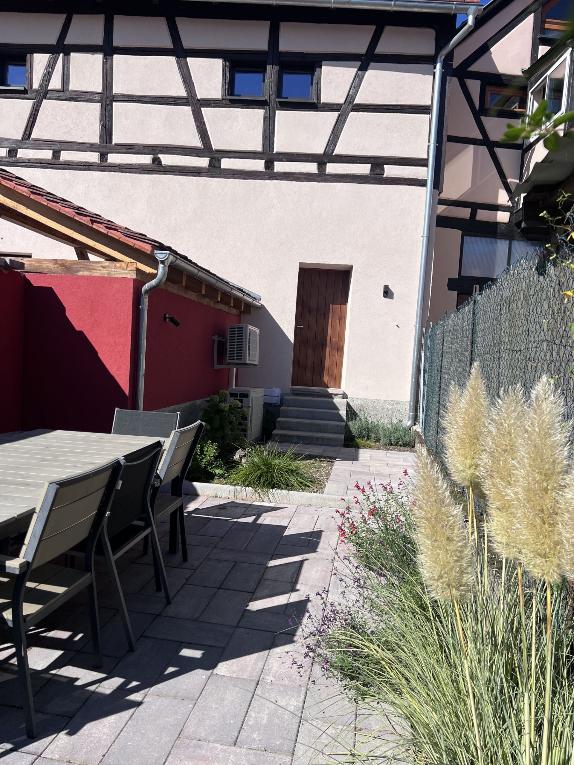 L’accès à la maison se fait par un petit espace extérieur aménagé avec une table pour profiter de repas ou moments de détente en plein air.